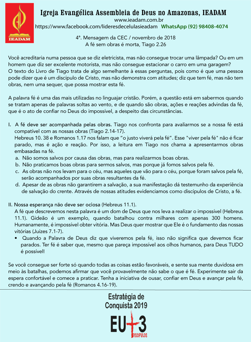 I. A fé deve ser acompanhada pelas obras. Tiago nos confronta para avaliarmos se a nossa fé está compatível com as nossas obras (Tiago 2.14-17).