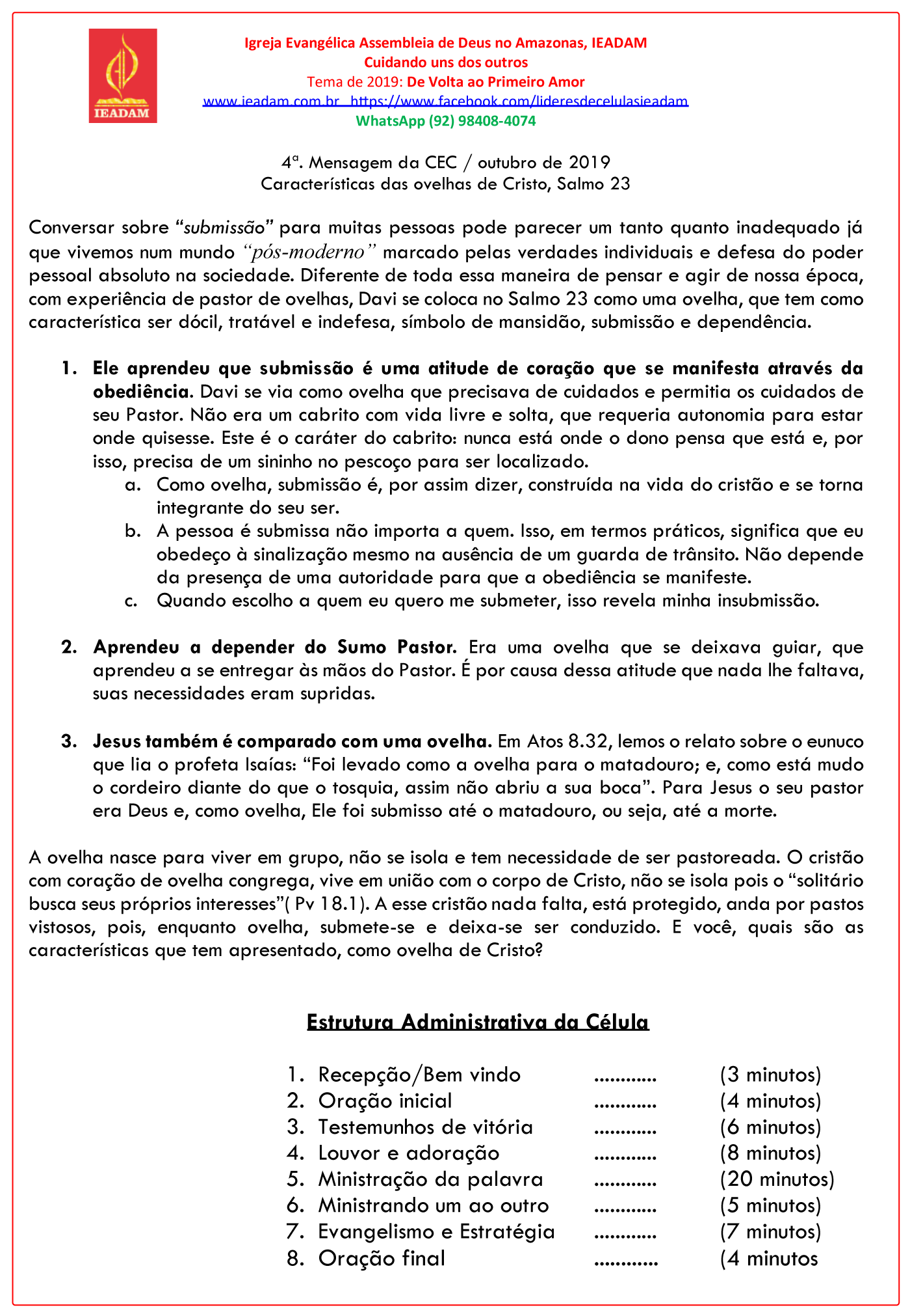 Muito bom acompanho sempre as mensagens das células pois sou líder de uma vencedores com Cristo. Meu muito obrigado por essas mensagens Deus continue lhe abençoando grandemente.