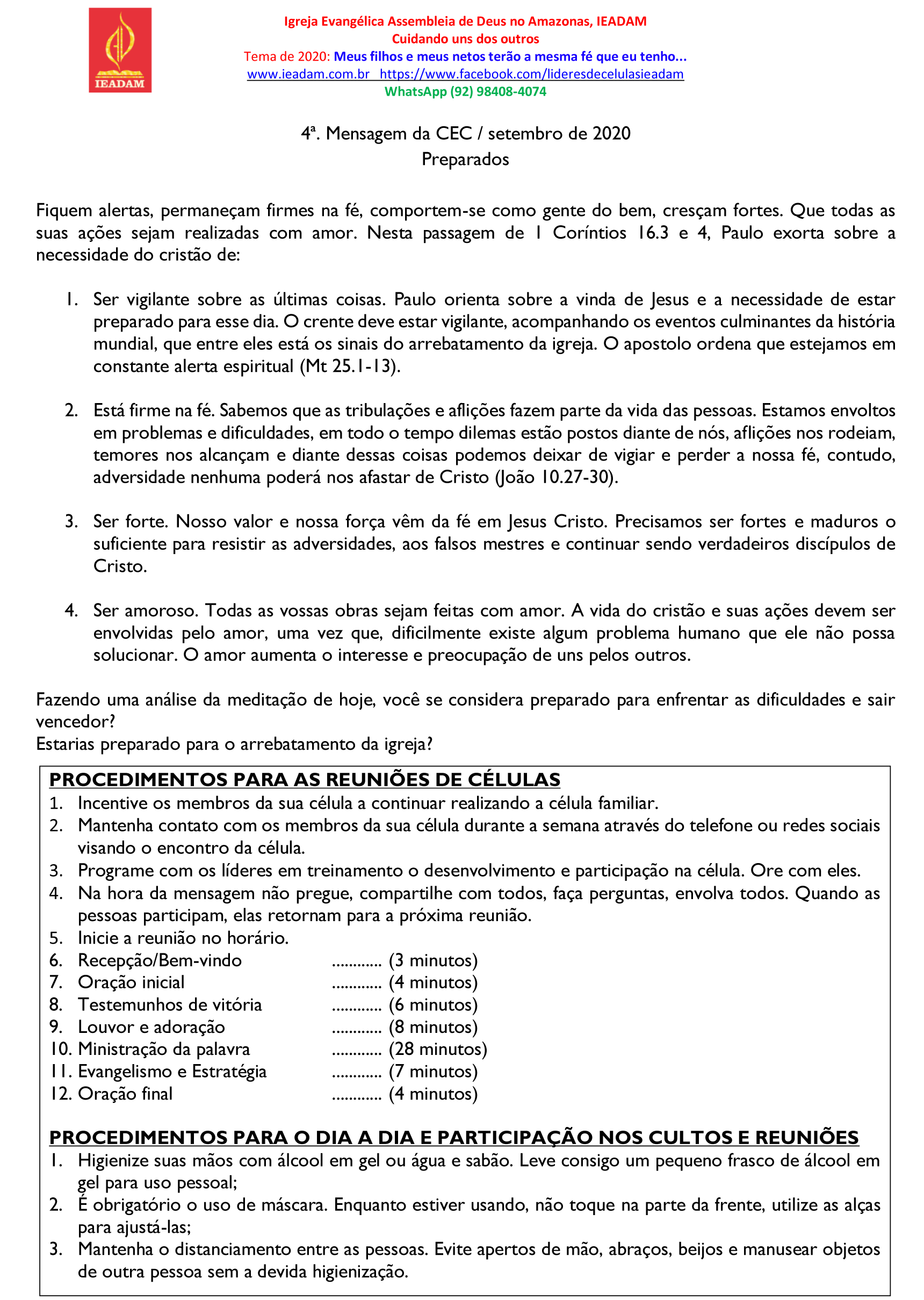 Fiquem alertas, permaneçam firmes na fé, comportem-se como gente do bem, cresçam fortes. Que todas as suas ações sejam realizadas com amor. Nesta passagem de 1 Coríntios 16.13 e 14, Paulo exorta sobre a necessidade do cristão de: