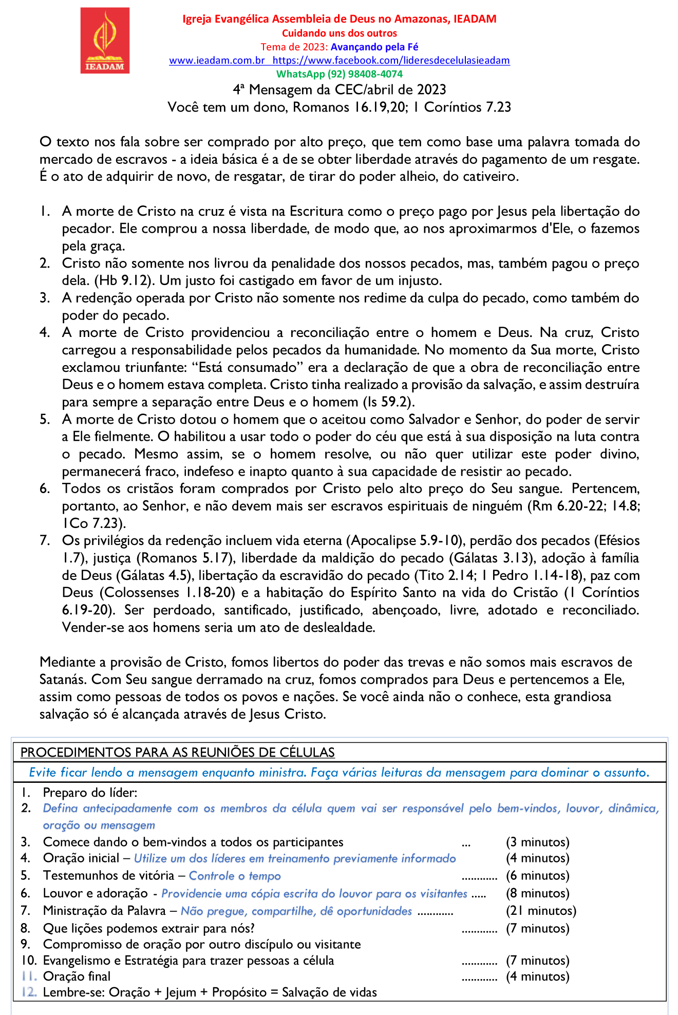 7. Os privilégios da redenção incluem vida eterna (Apocalipse 5.9-10), perdão dos pecados (Efésios 1.7), justiça (Romanos 5.17), liberdade da maldição do pecado (Gálatas 3.13), adoção à família de Deus (Gálatas 4.5), libertação da escravidão do pecado (Tito 2.14; 1 Pedro 1.14-18), paz com Deus (Colossenses 1.18-20) e a habitação do Espírito Santo na vida do Cristão (1 Coríntios 6.19-20). Ser perdoado, santificado, justificado, abençoado, livre, adotado e reconciliado. Vender-se aos homens seria um ato de deslealdade.