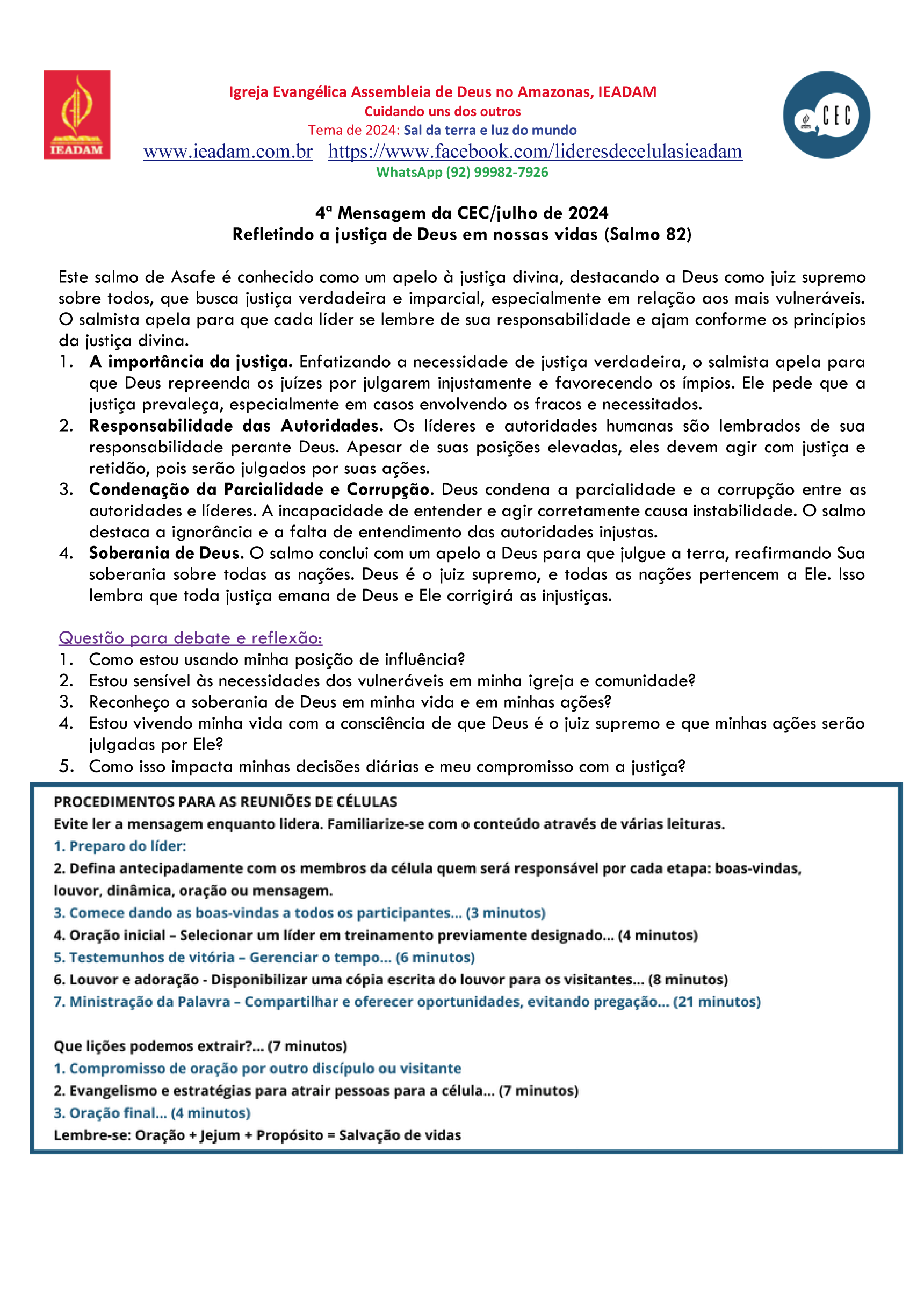 4ª Mensagem da CEC/julho de 2024 Refletindo a justiça de Deus em nossas vidas (Salmo 82)