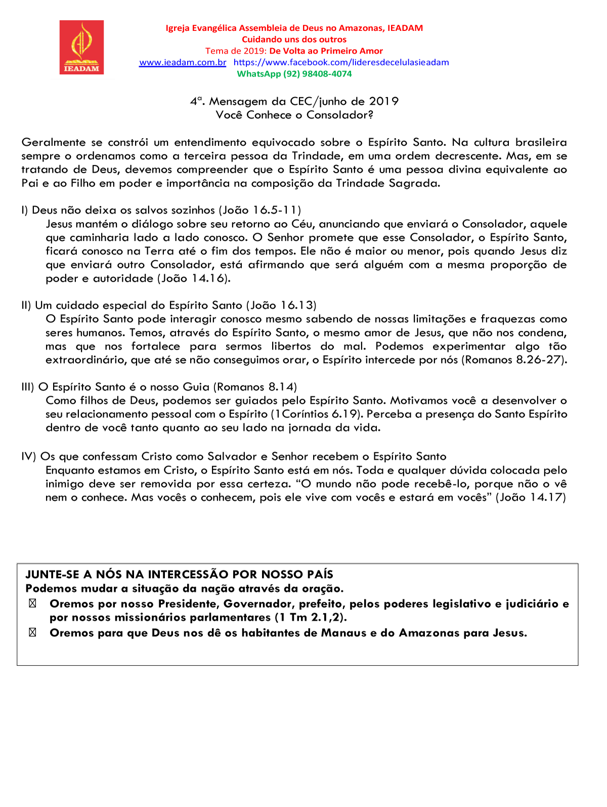 4ª. Mensagem da CEC/junho de 2019 Você Conhece o Consolador?