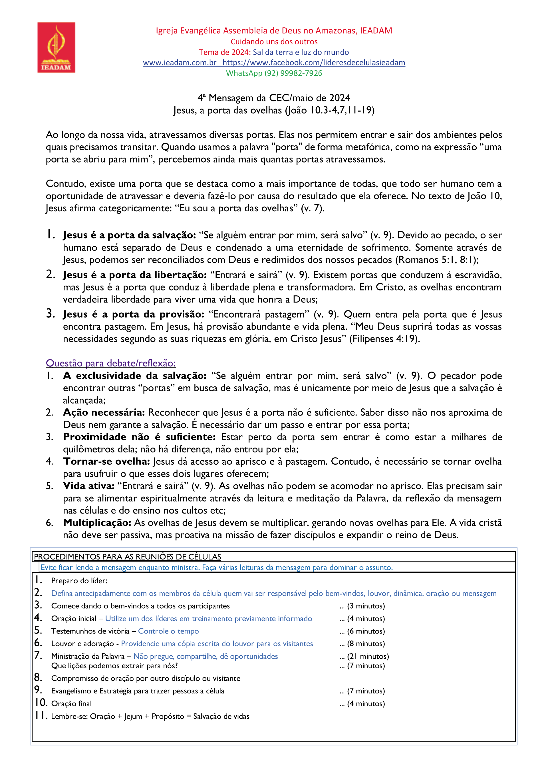 1. Jesus é a porta da salvação: “Se alguém entrar por mim, será salvo” (v. 9). Devido ao pecado, o ser humano está separado de Deus e condenado a uma eternidade de sofrimento. Somente através de Jesus, podemos ser reconciliados com Deus e redimidos dos nossos pecados (Romanos 5:1, 8:1);