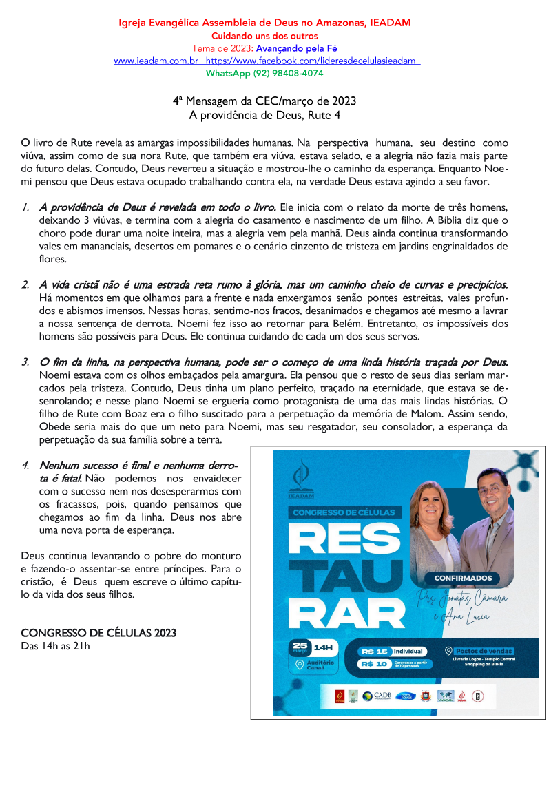 2. A vida cristã não é uma estrada reta rumo à glória, mas um caminho cheio de curvas e precipícios.Há momentos em que olhamos para a frente e nada enxergamos senão pontes estreitas, vales profundos e abismos imensos. Nessas horas, sentimo-nos fracos, desanimados e chegamos até mesmo a lavrar a nossa sentença de derrota. Noemi fez isso ao retornar para Belém. Entretanto, os impossíveis dos homens são possíveis para Deus. Ele continua cuidando de cada um dos seus servos.
