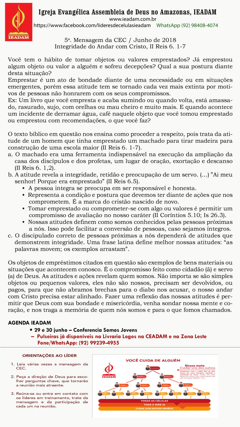 - A atitude revela a integridade, retidão e preocupação de um servo. (…) ”Ai meu senhor! Porque era emprestado” (II Reis 6.5).