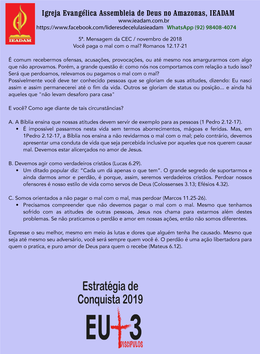 - É impossível passarmos nesta vida sem termos aborrecimentos, mágoas e feridas. Mas, em 1Pedro 2.12-17, a Bíblia nos ensina a não revidarmos o mal com o mal; pelo contrário, devemos apresentar uma conduta de vida que seja percebida inclusive por aqueles que nos querem causar mal. Devemos estar alicerçados no amor de Jesus.