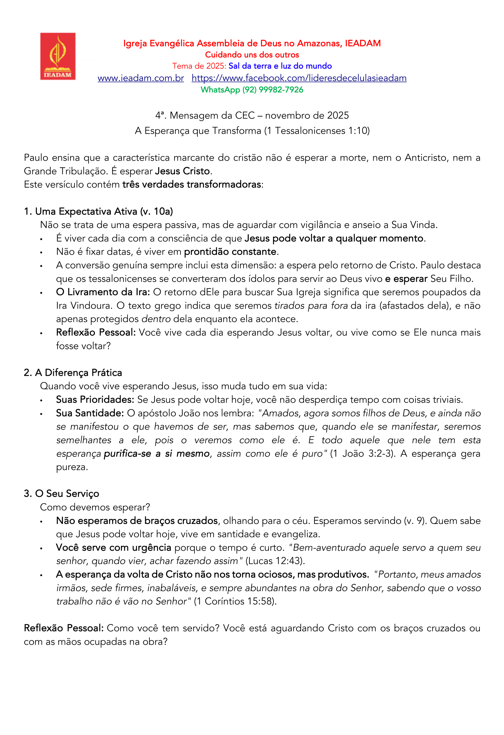 - Não esperamos de braços cruzados, olhando para o céu. Esperamos servindo (v. 9). Quem sabe que Jesus pode voltar hoje, vive em santidade e evangeliza.