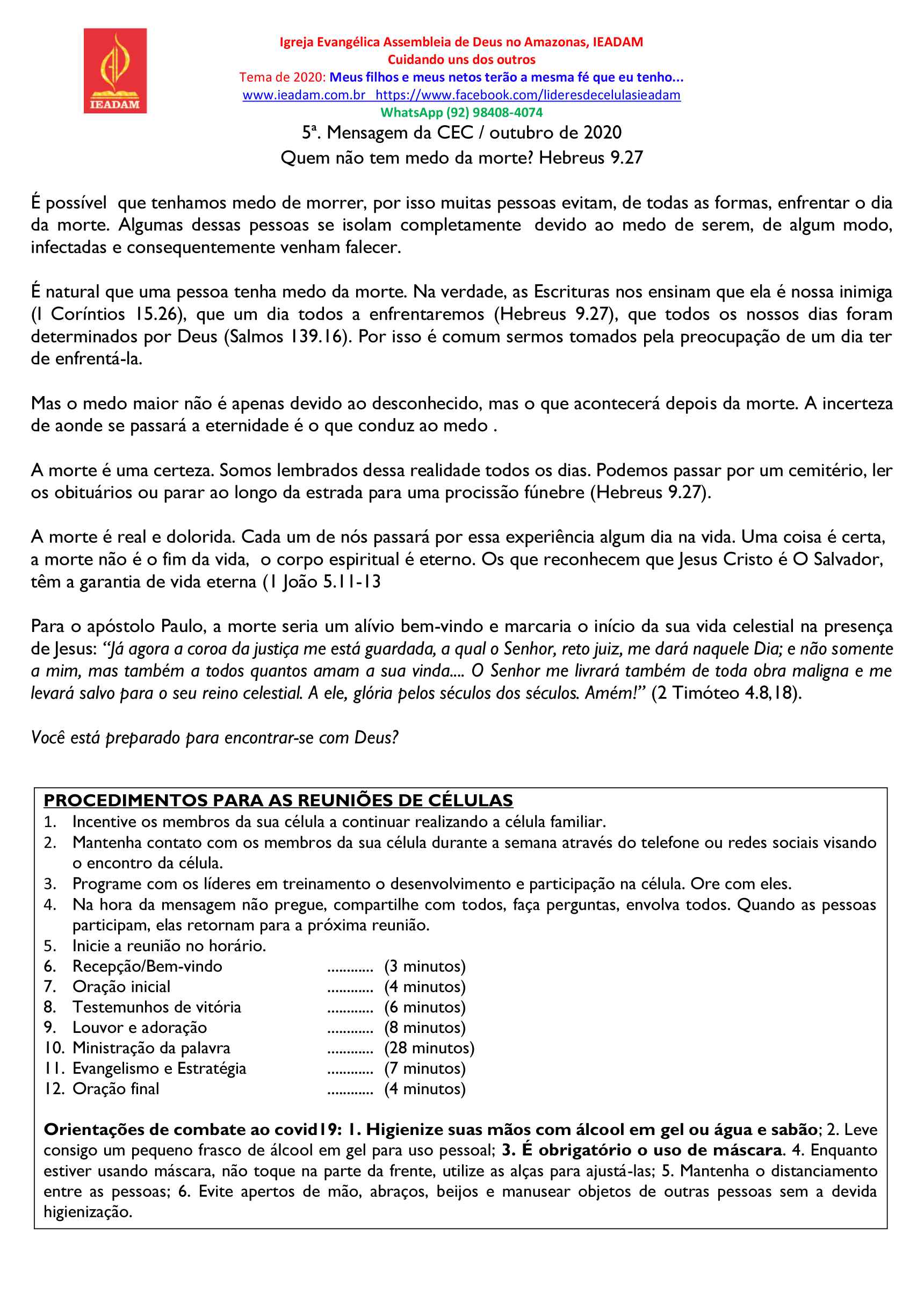 Para o apóstolo Paulo, a morte seria um alívio bem-vindo e marcaria o início da sua vida celestial na presença de Jesus: “Já agora a coroa da justiça me está guardada, a qual o Senhor, reto juiz, me dará naquele Dia; e não somente a mim, mas também a todos quantos amam a sua vinda…. O Senhor me livrará também de toda obra maligna e me levará salvo para o seu reino celestial. A ele, glória pelos séculos dos séculos. Amém!” (2 Timóteo 4.8,18).