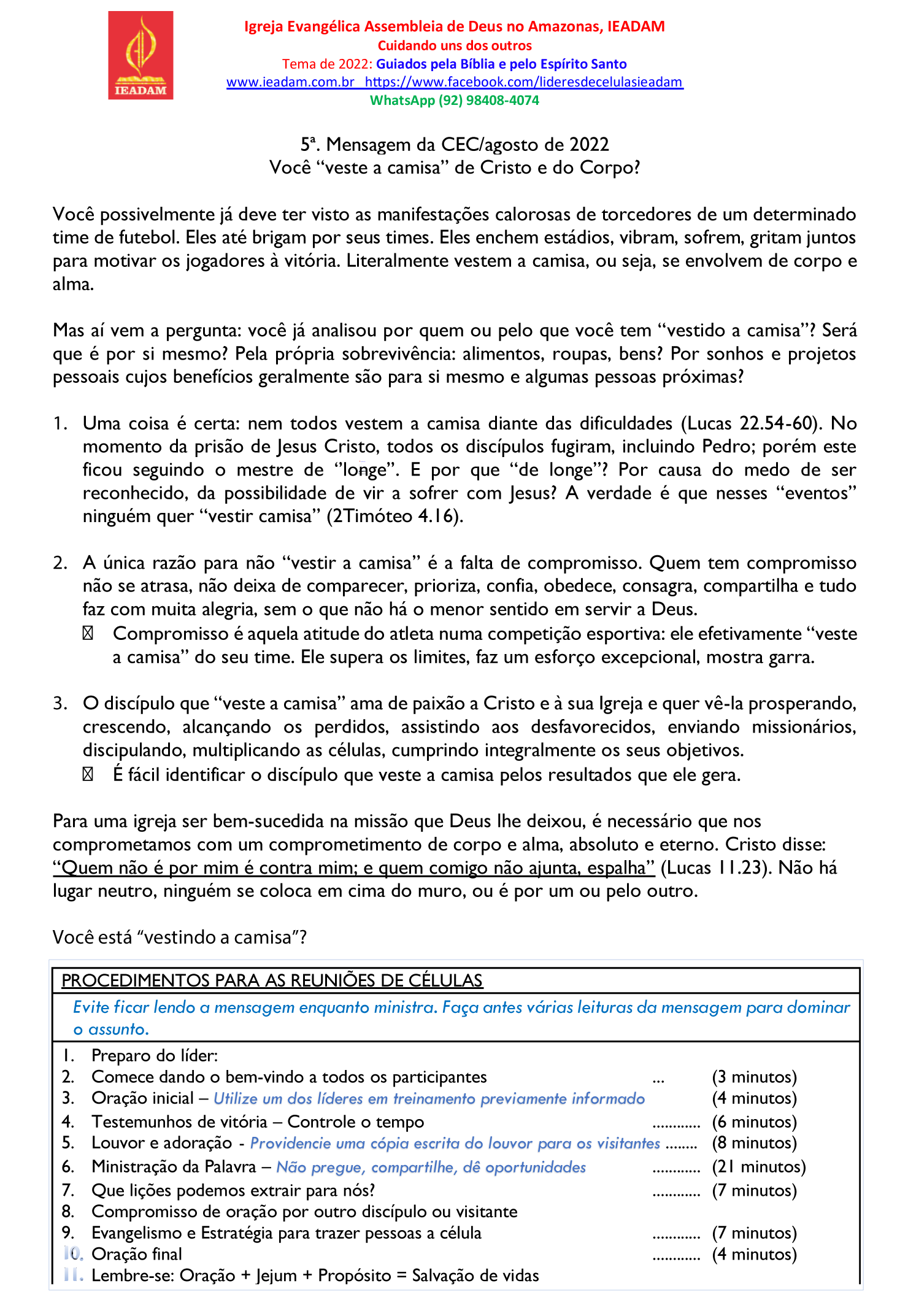 3. O discípulo que “veste a camisa” ama de paixão a Cristo e à sua Igreja e quer vê-la prosperando, crescendo, alcançando os perdidos, assistindo aos desfavorecidos, enviando missionários, discipulando, multiplicando as células, cumprindo integralmente os seus objetivos.