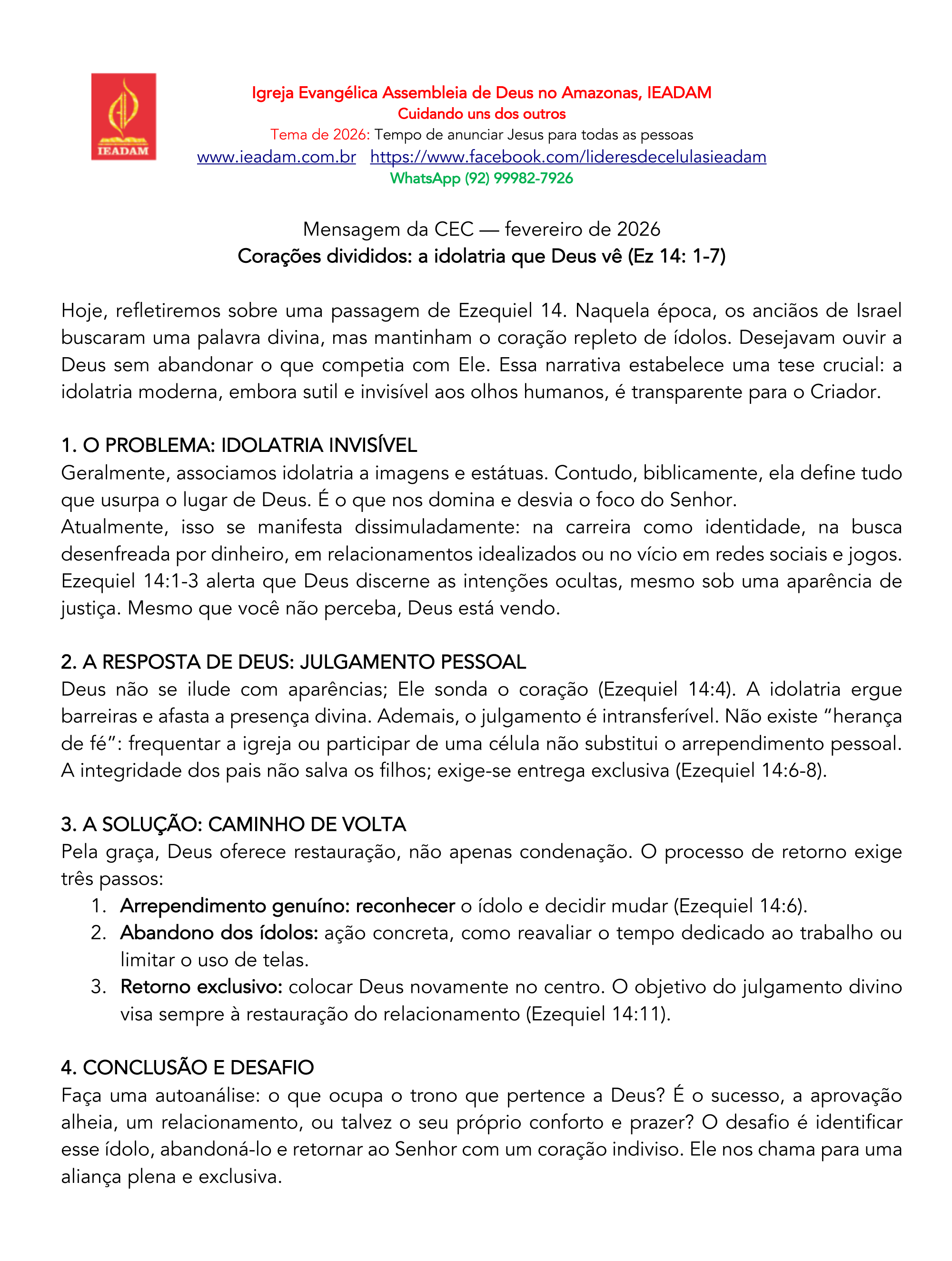 Hoje, refletiremos sobre uma passagem de Ezequiel 14. Naquela época, os anciãos de Israel buscaram uma palavra divina, mas mantinham o coração repleto de ídolos. Desejavam ouvir a Deus sem abandonar o que competia com Ele. Essa narrativa estabelece uma tese crucial: a idolatria moderna, embora sutil e invisível aos olhos humanos, é transparente para o Criador.