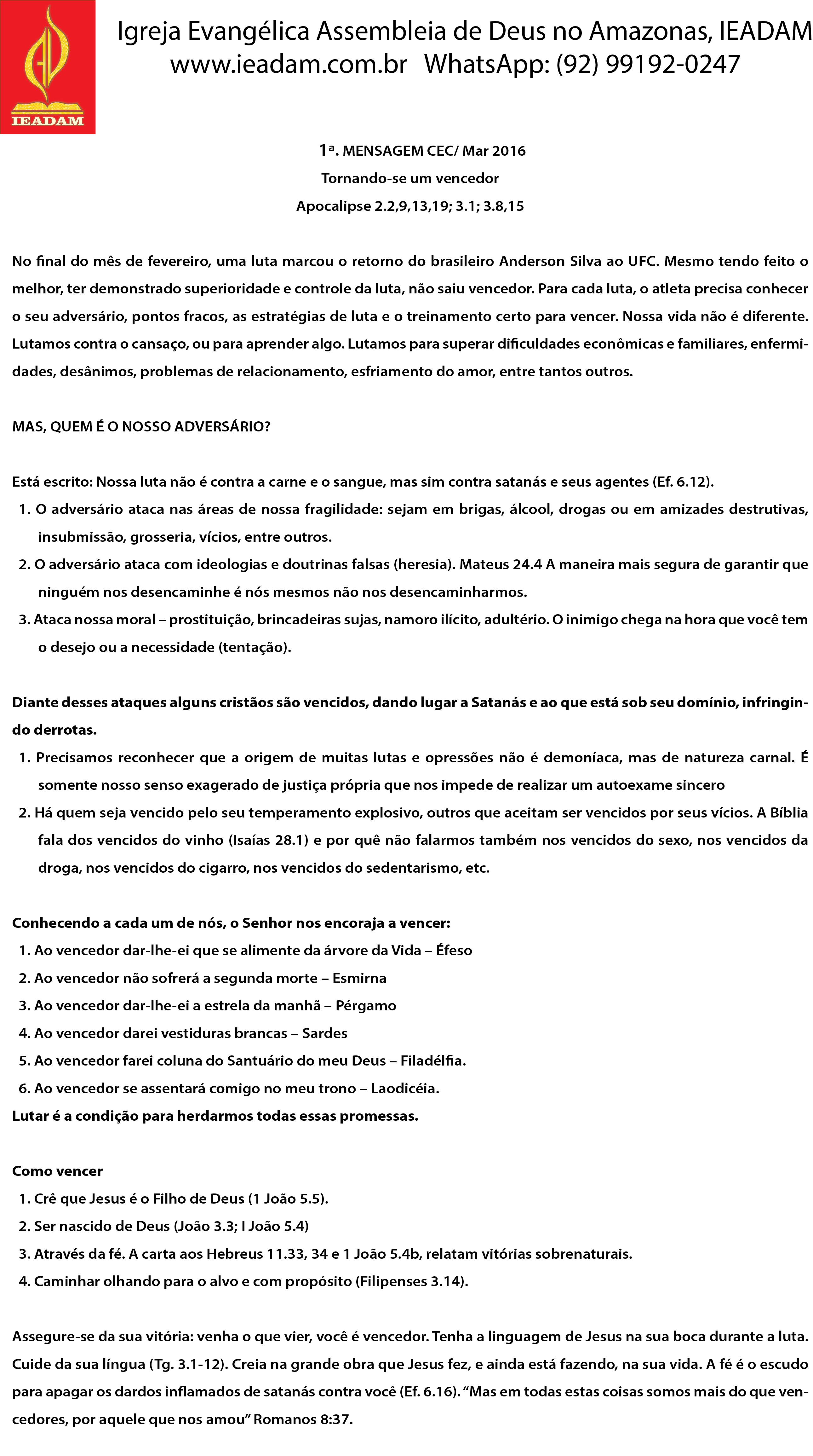 1ª Mensagem da CEC / Março de 2016 Tornando-se um vencedor! Apocalipse 2.2,9,13,19; 3.1; 3.8,15